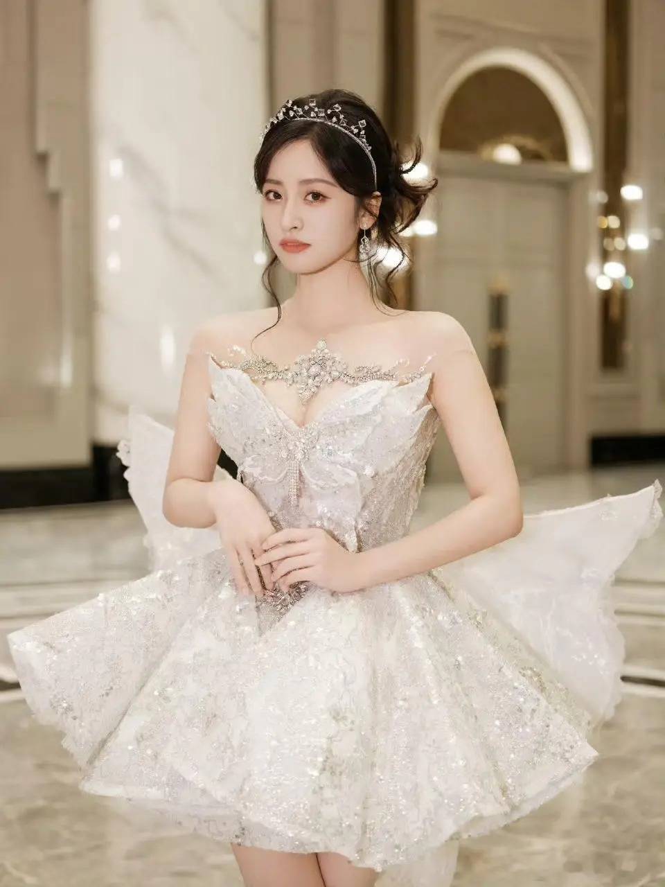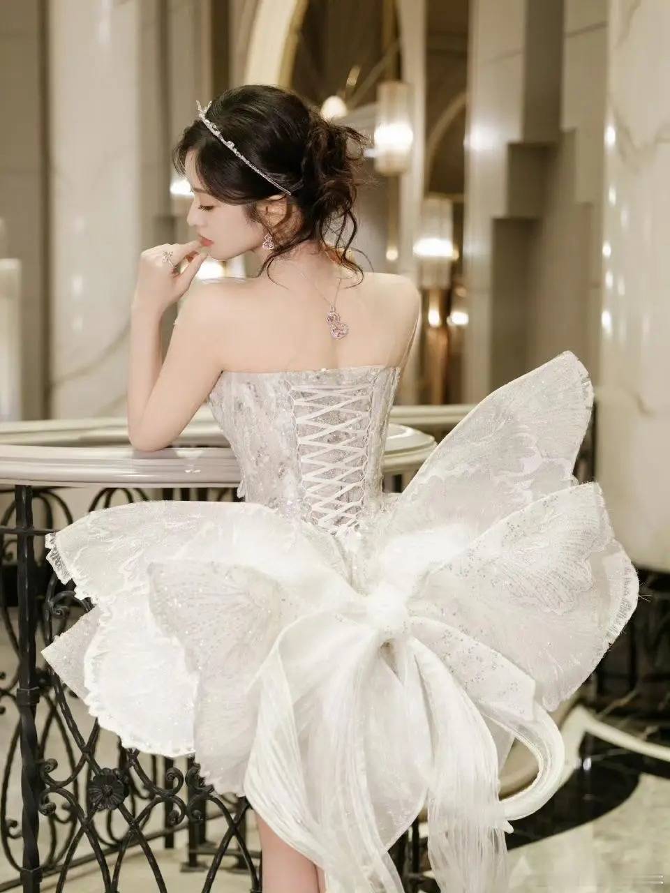 这件白裙设计独特,完美融合了性感与优雅。露肩款式展现出沈月迷人锁骨与优美肩部线条,紧身胸衣设计凸显其凹凸有致的身材曲线。裙摆处大蝴蝶结设计是点睛之笔,增加造型层次感,为整体look增添浪漫梦幻色彩。沈月穿上此白裙,仿若优雅白天鹅,高贵迷人。